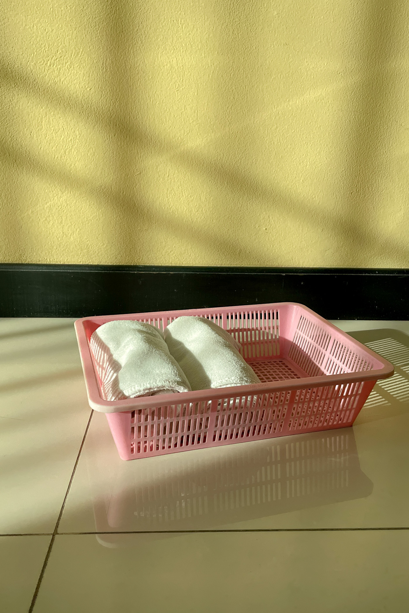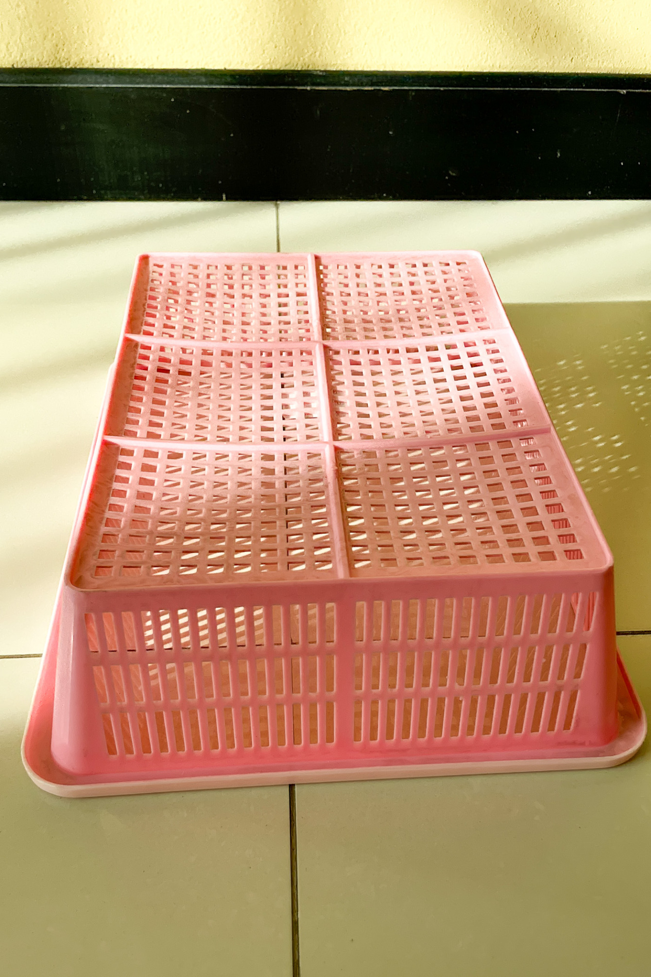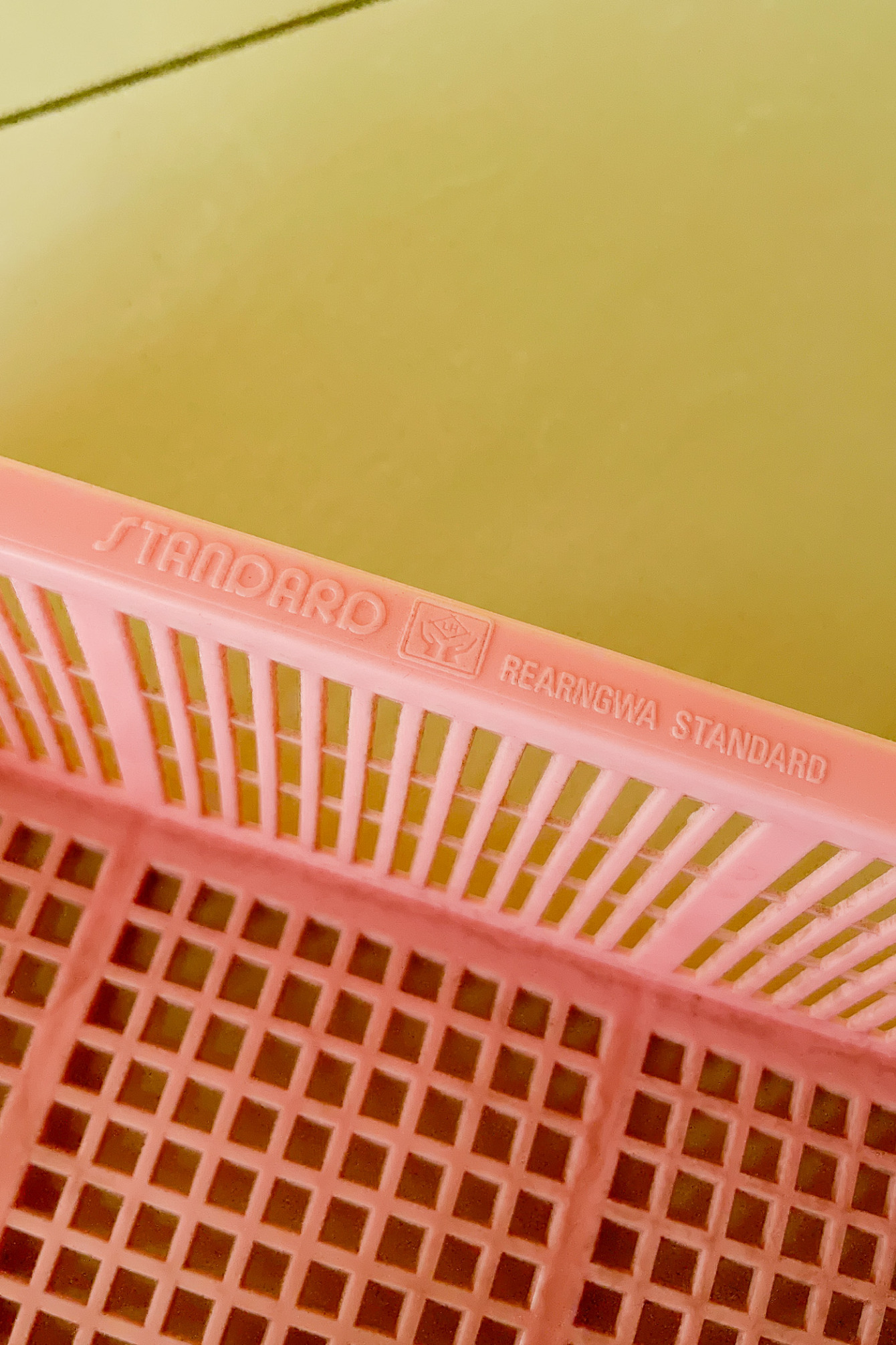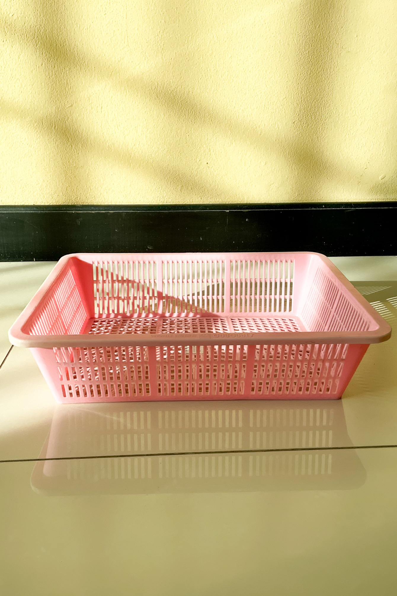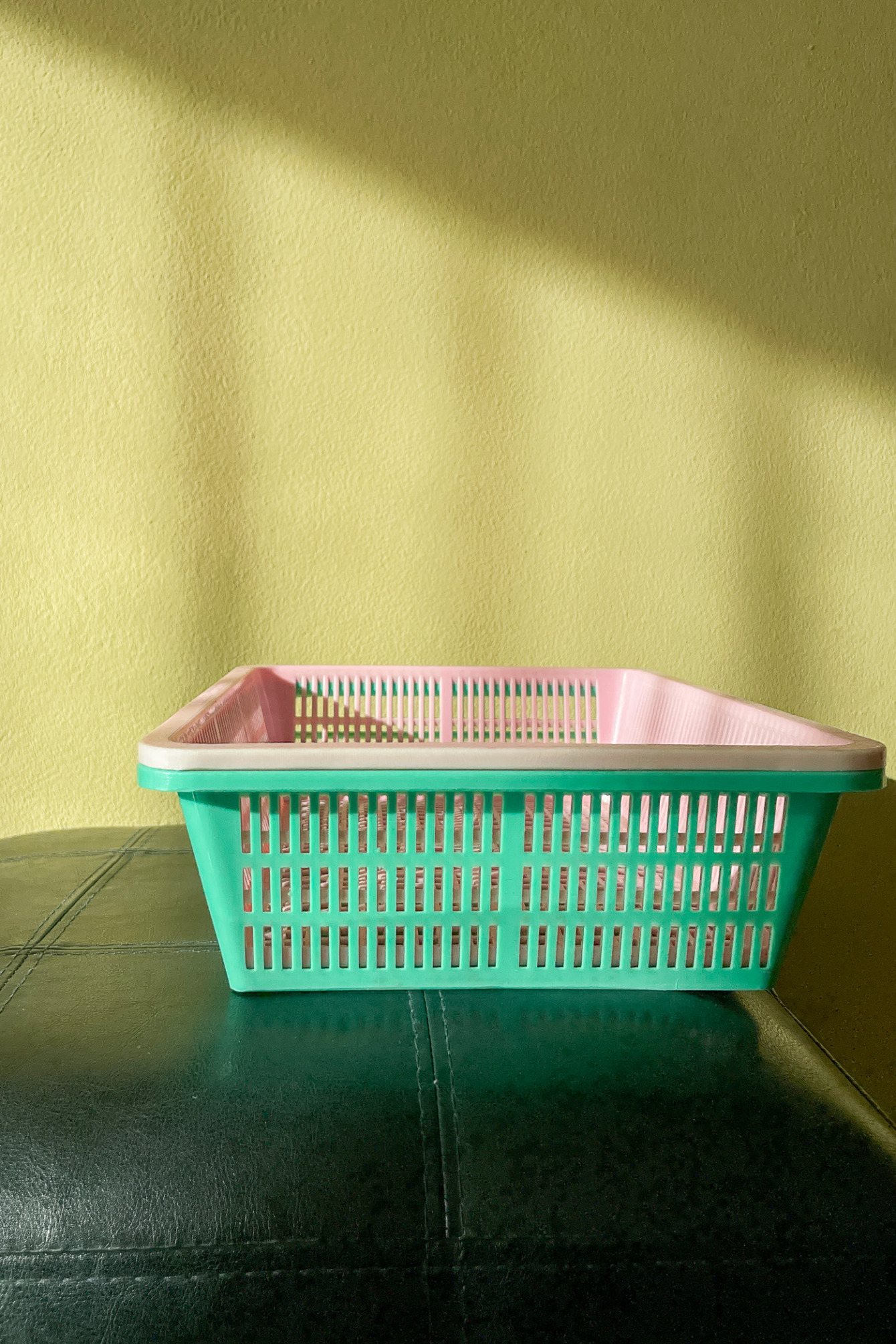 懐かしい感じのするプラスチックのバスケット。タイではローカルな市場で商品陳列のカゴとしてよく使われていますここ最近では見かけなくなって来ました。パステル調の色味然り80’s感満載です。状態の良いものを選びましたがグリーンと共に1点のみずつになります。