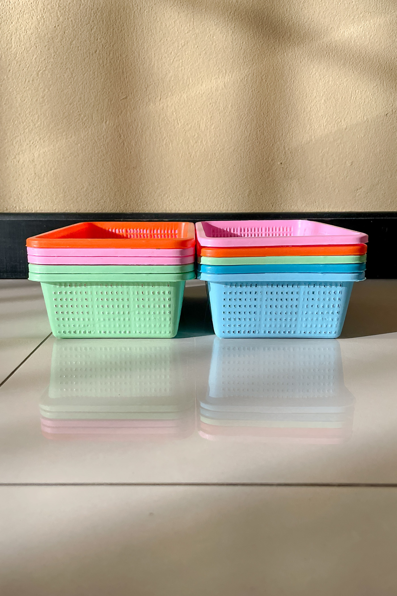懐かしい感じのするプラスチックのバスケット。タイではローカルな市場で商品陳列のカゴとしてよく使われていますここ最近では見かけなくなって来ました。パステル調の色味然り80’s感満載です。細々した物を入れておくのに便利尚且つ可愛いほっこりするバスケット。小さなフルーツや野菜を洗うキッチンで使うザルとしても良さそうです。