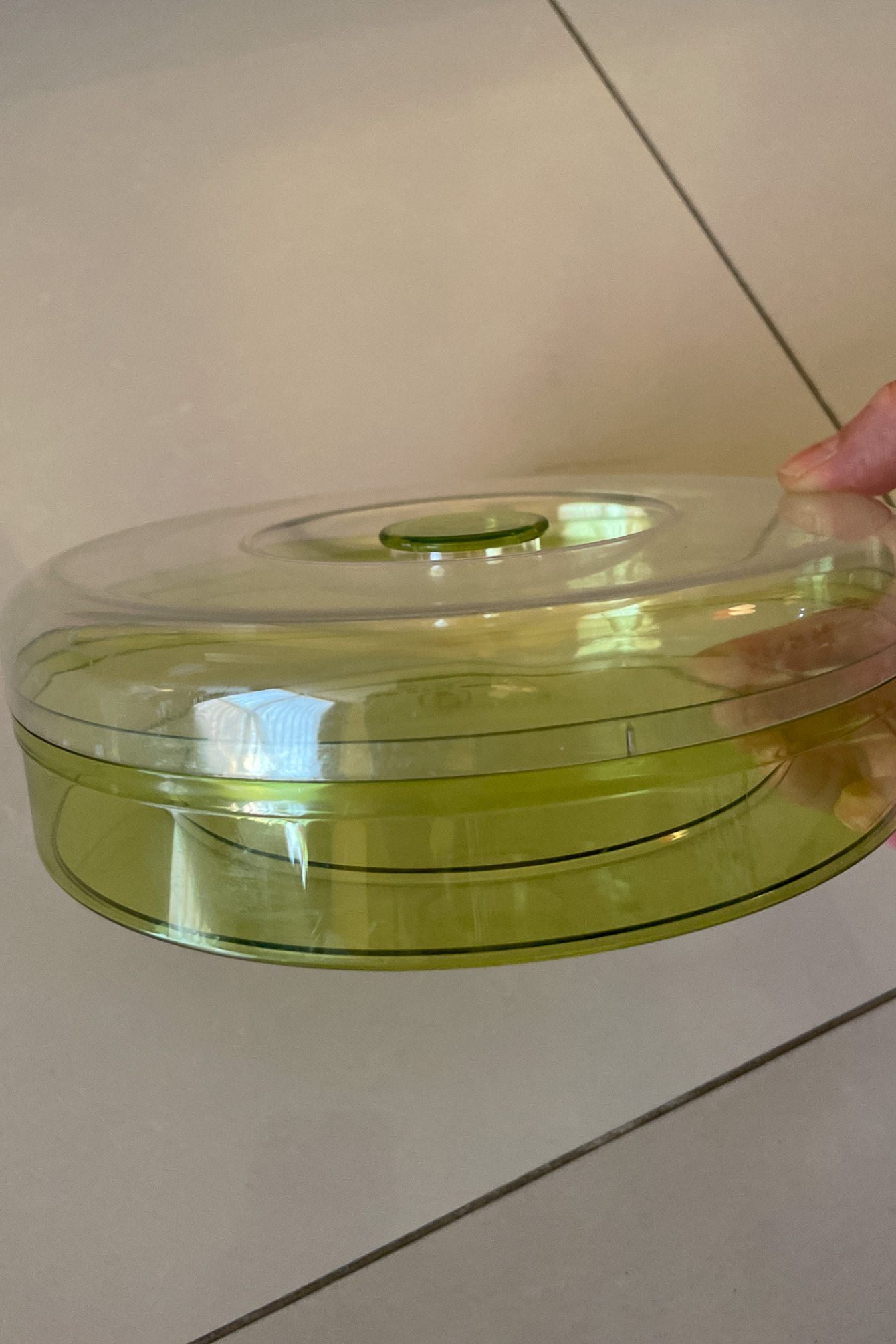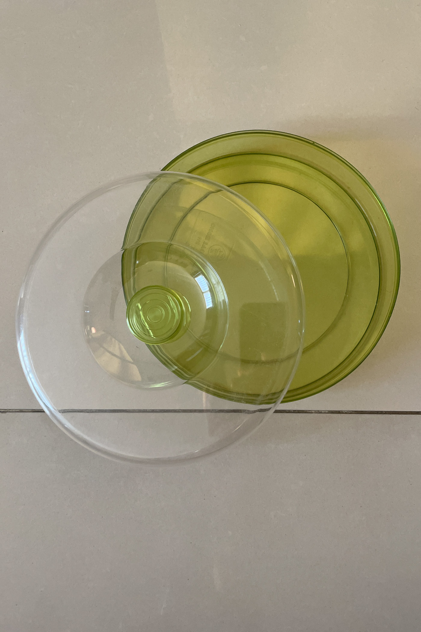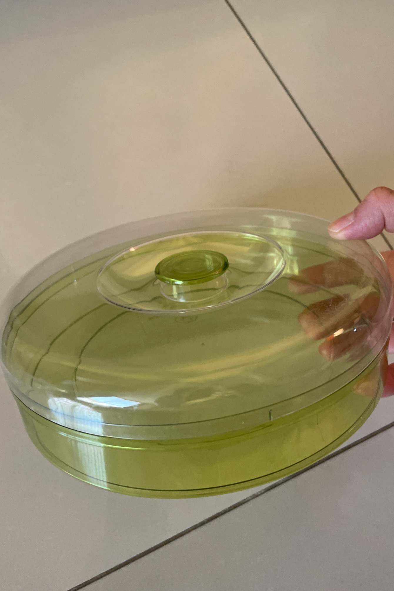 クッキーまたはキャンディーボックス。昔ながらのケーキショップなどでクッキーを詰めて売られている時によく見かけます。薄手で軽いプラスチック。カランカランという音も相まってノスタルジックな雰囲気の丸い箱です。