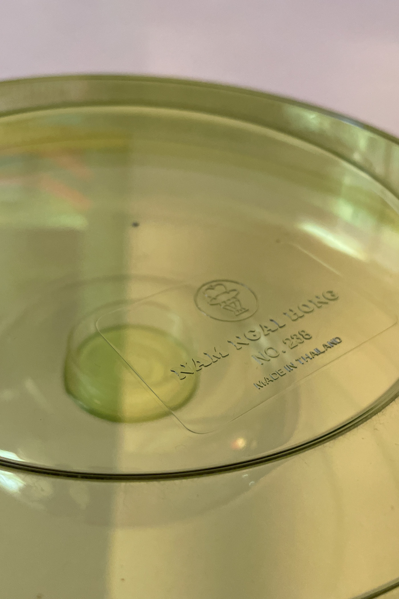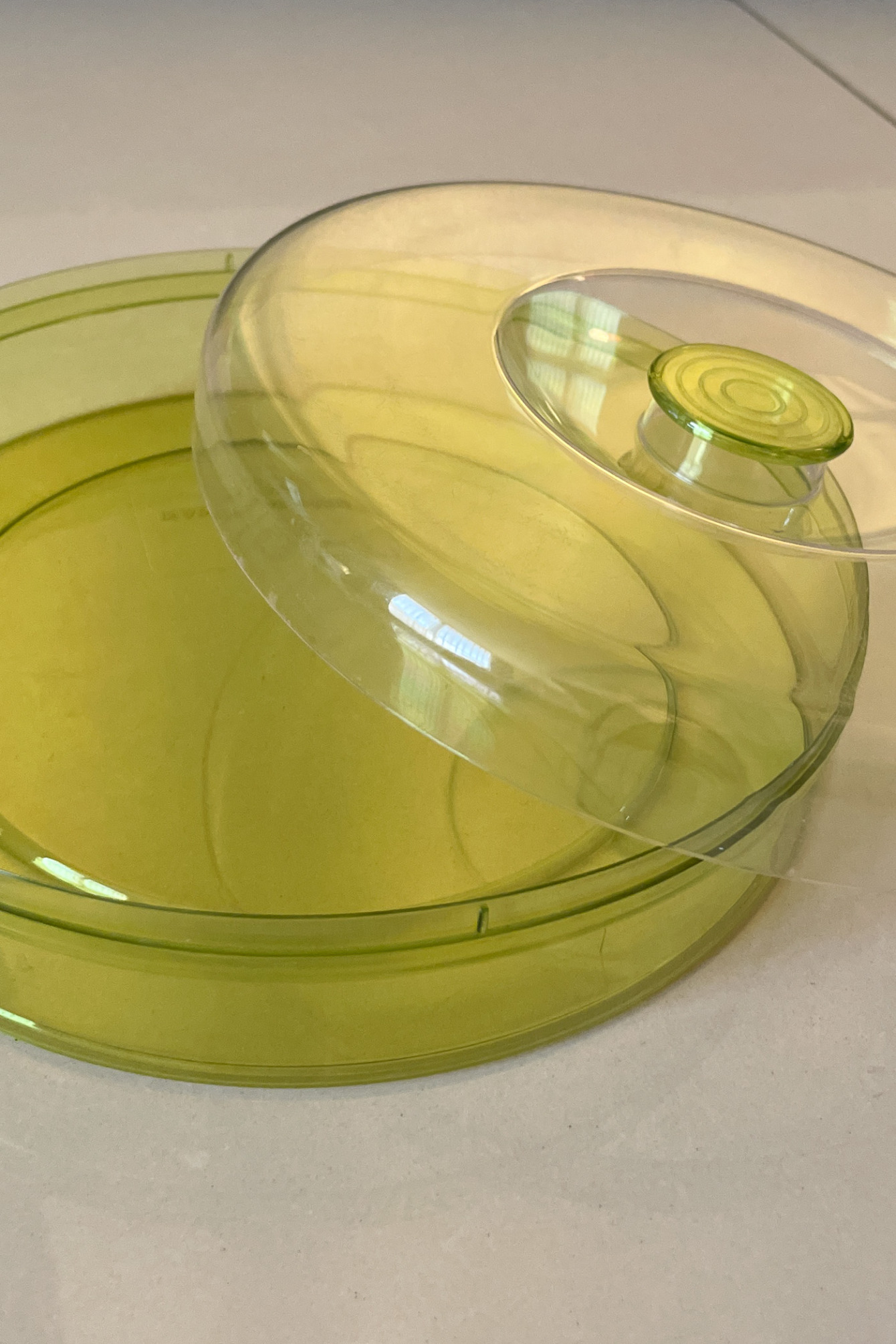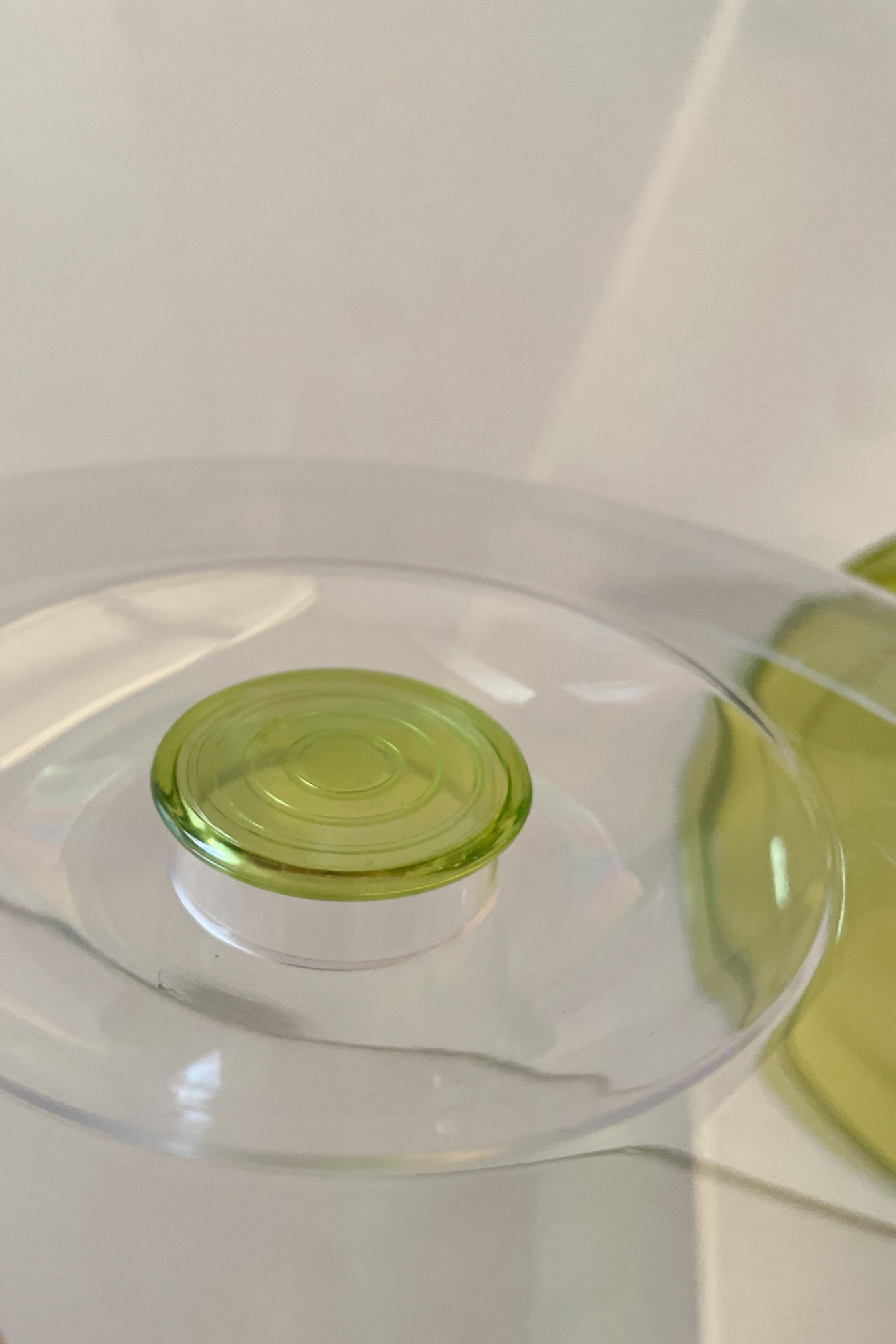 クッキーまたはキャンディーボックス。昔ながらのケーキショップなどでクッキーを詰めて売られている時によく見かけます。薄手で軽いプラスチック。カランカランという音も相まってノスタルジックな雰囲気の丸い箱です。