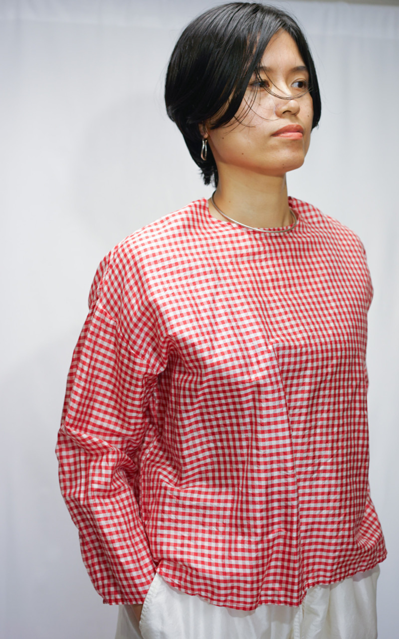Gingham Check Thai Silk Pullover Shirts [RED]